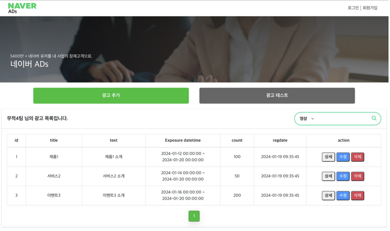 한 화면에서 모달창을 띄우는 방식으로 진행되기 때문에 mainPage.js에서 광고 추가, 광고 테스트, 광고 목록을 모두 보여준다.