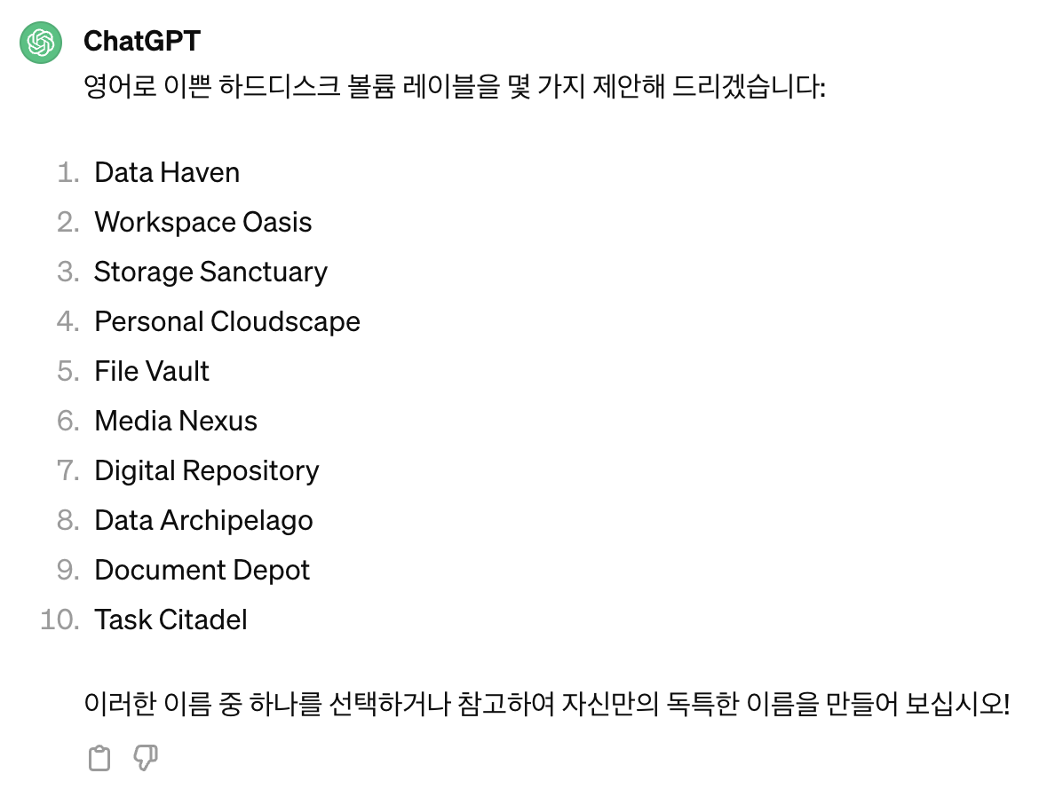 그리고 디스크 명이 기본적으로 '새 디스크'로 되어있는데 뭔가 밋밋해서 GPT에게 물어봤다.