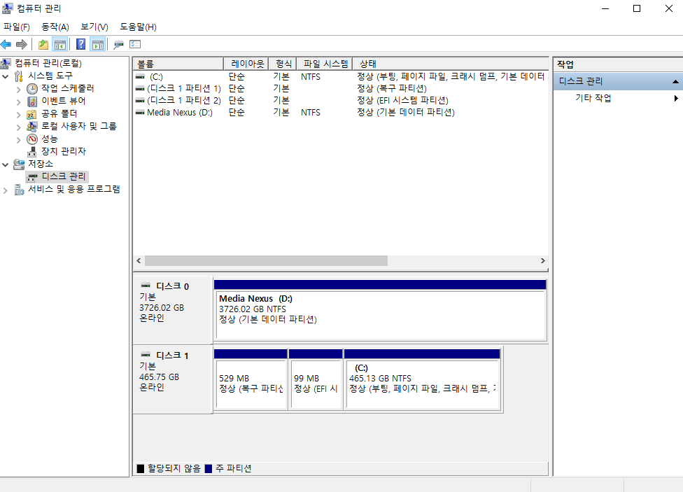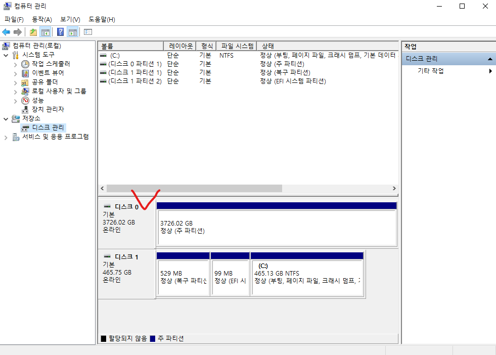 2. 컴퓨터 관리(로컬) > 저장소 > 디스크관리에서 내 디스크를 확인한다.