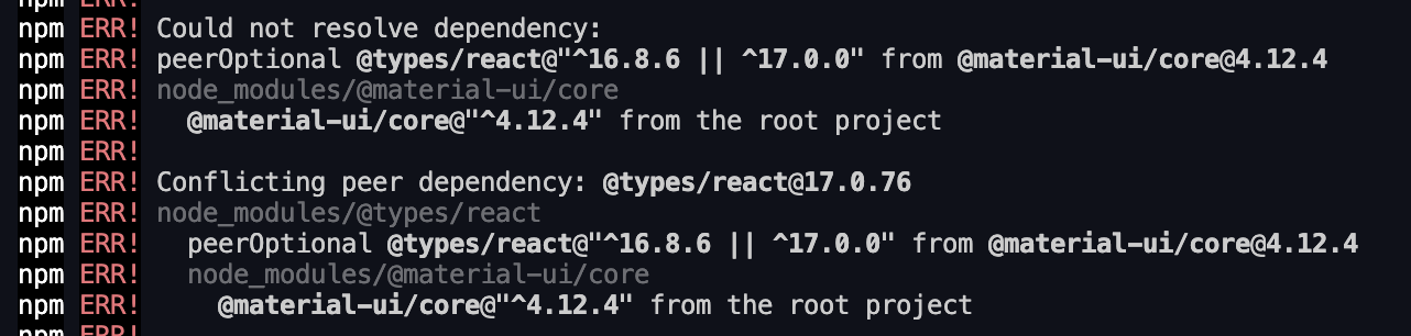 @material-ui/core@4.12.4는 @types/react@"^16.8.6 || ^17.0.0"을 종속성으로 필요하는데,