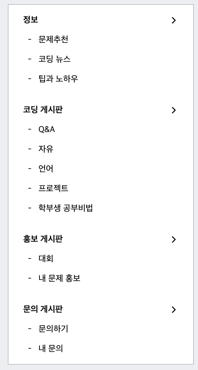 <정보 게시판>, <코딩 게시판>, <홍보 게시판>, <문의 게시판> 4개의 큰 카테고리 안에는 각각 작은 카테고리가 있다.