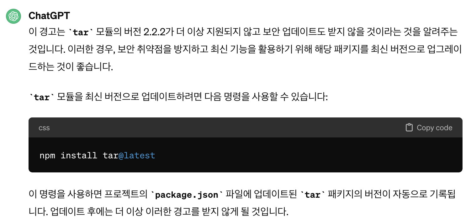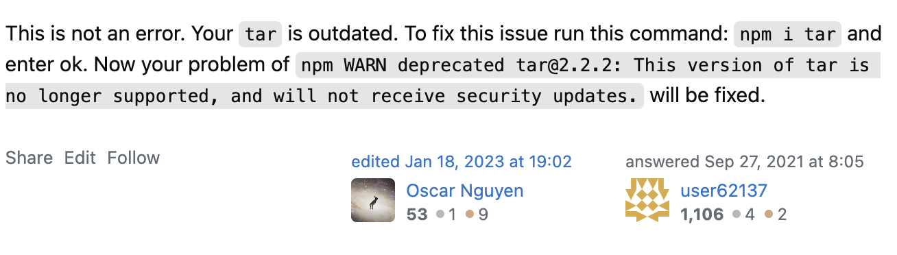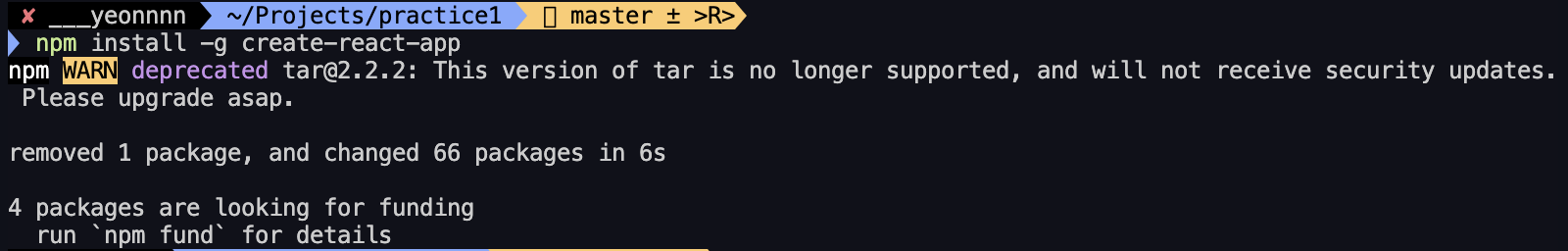 npm WARN deprecated tar@2.2.2: This version of tar is no longer supported, and will not receive security updates. Please upgrade