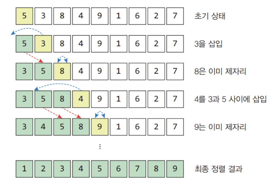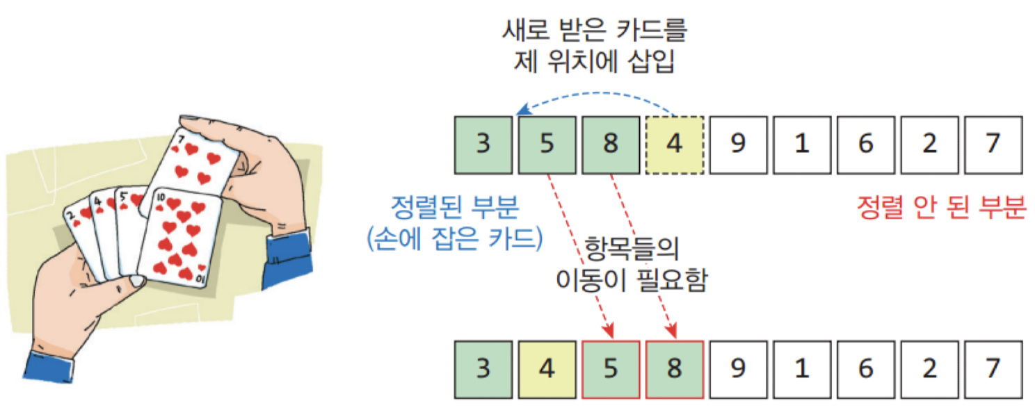 정렬되어 있는 부분에 새로운 레코드를 올바른 위치에 삽입하는 과정을 반복
