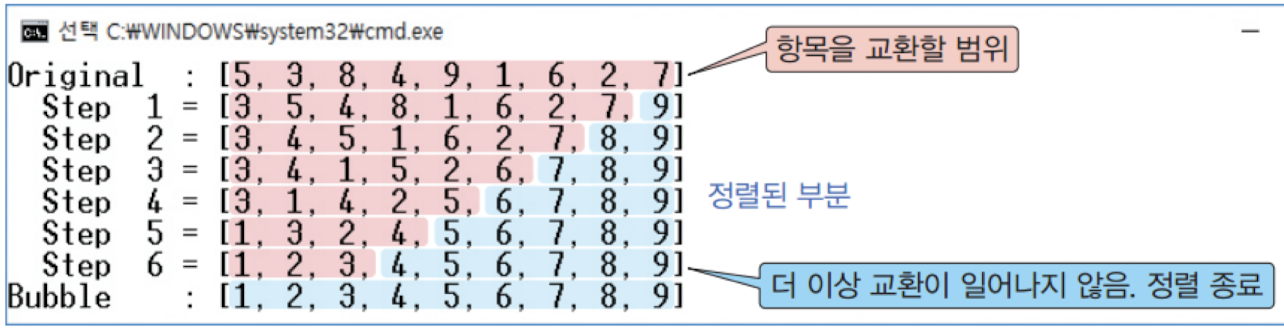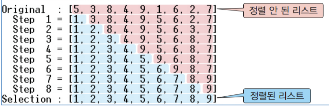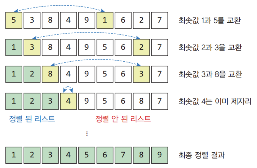 출력 배열이 추가로 필요할 수도 있지만, 최솟값이 선택되면 이것을 맨 앞의 요소와 교환하는 전략을 사용해 하나의 배열로 사용 가능하다.