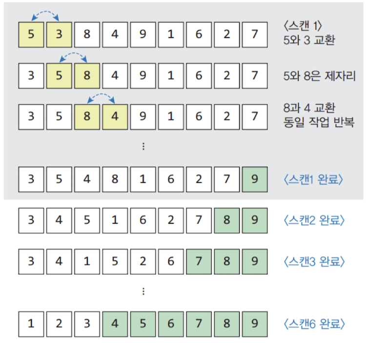 -> 한 번의 스캔이 완료되면 가장 큰 레코드가 리스트의 오른쪽 끝으로 이동