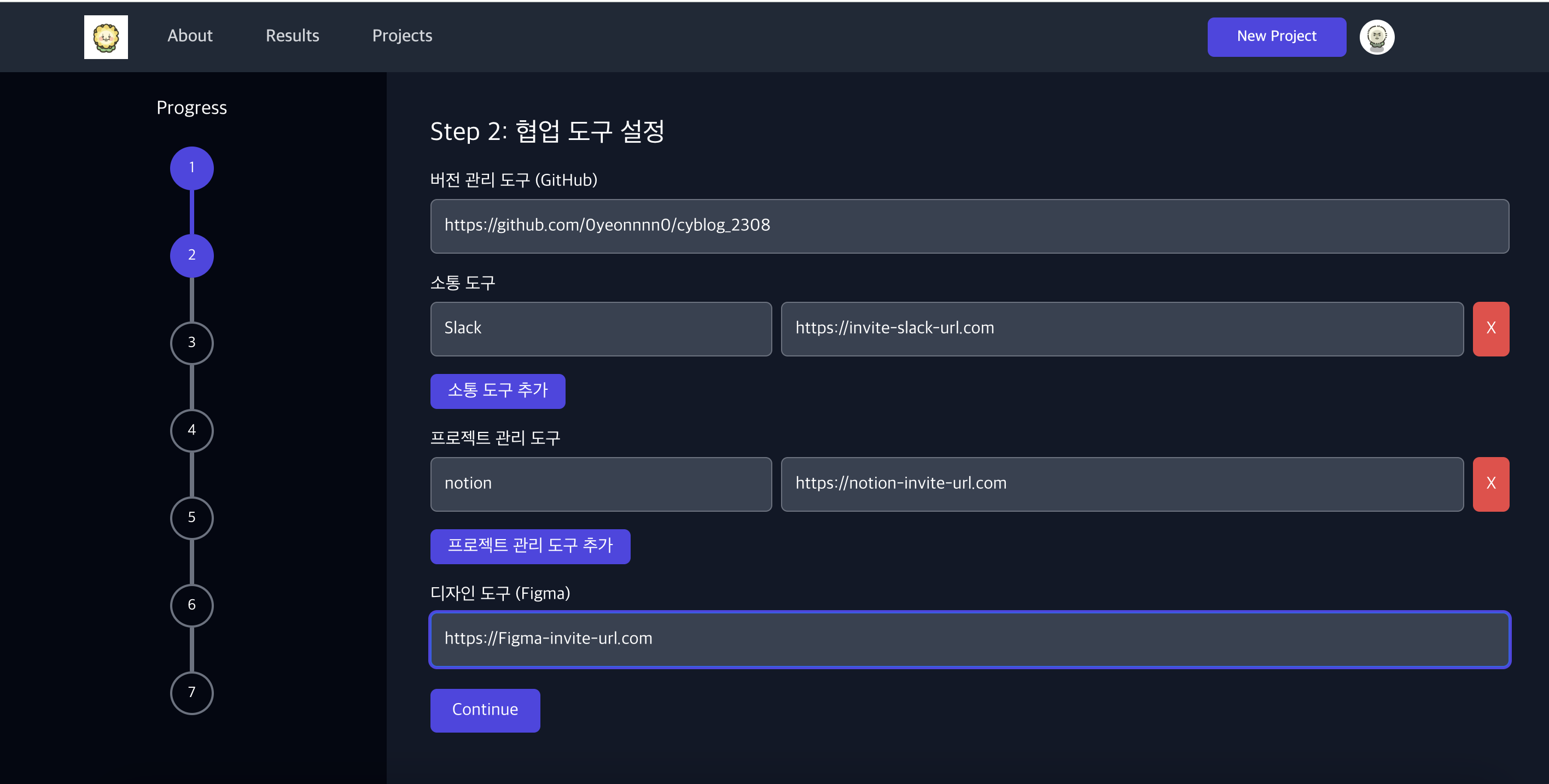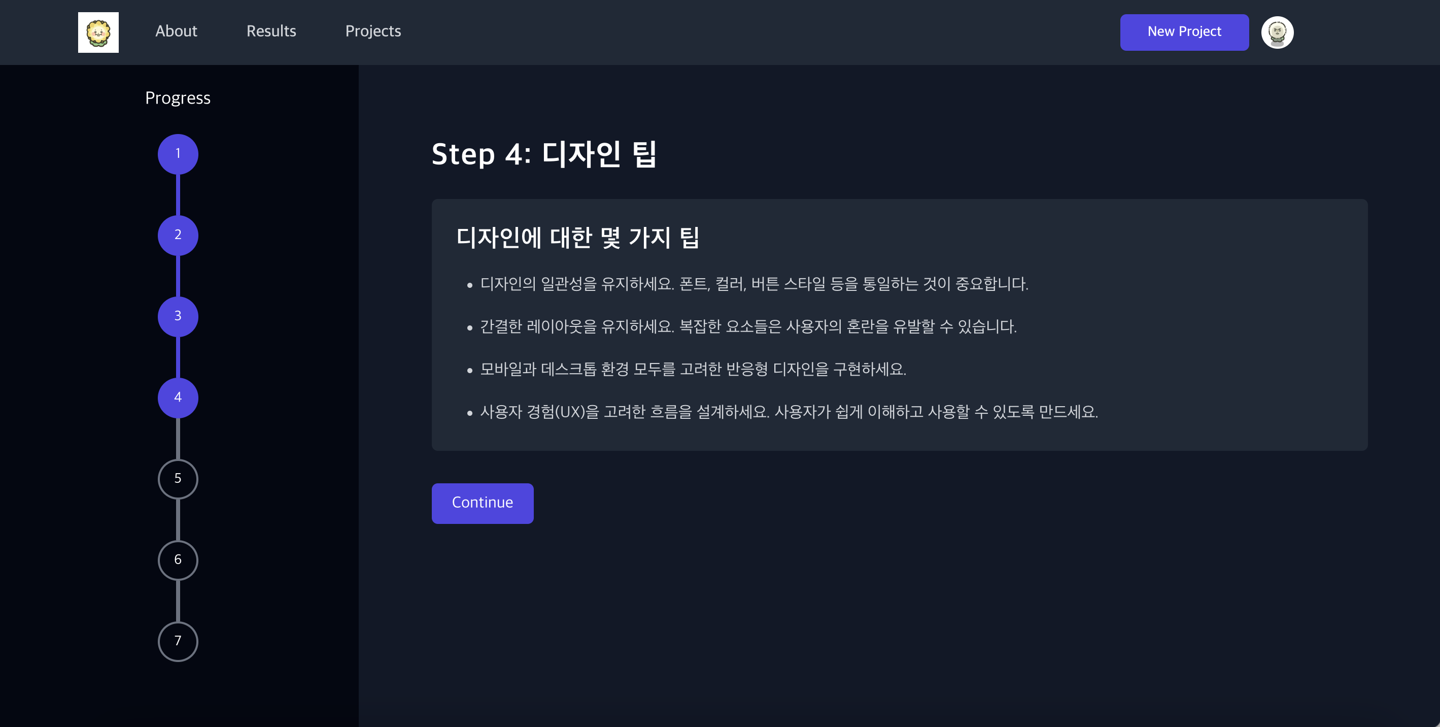 7 Steps로 이뤄져 있고, Continue 버튼을 누르면 다음 단계로 넘어갑니다.