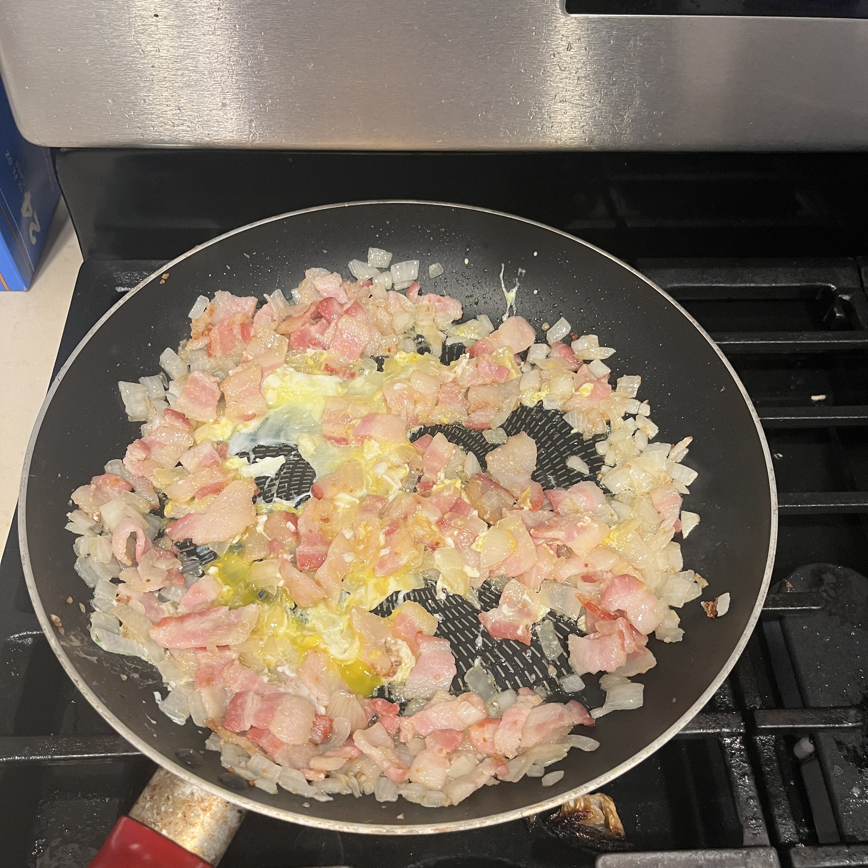 좀 노릇노릇해지면 계란 하나를 넣고 으깨줍니다.