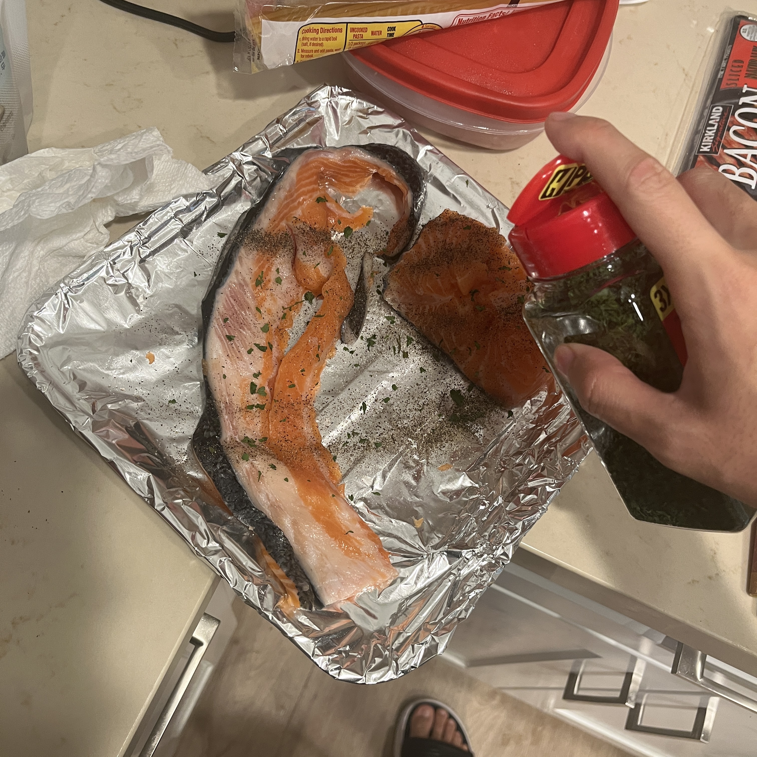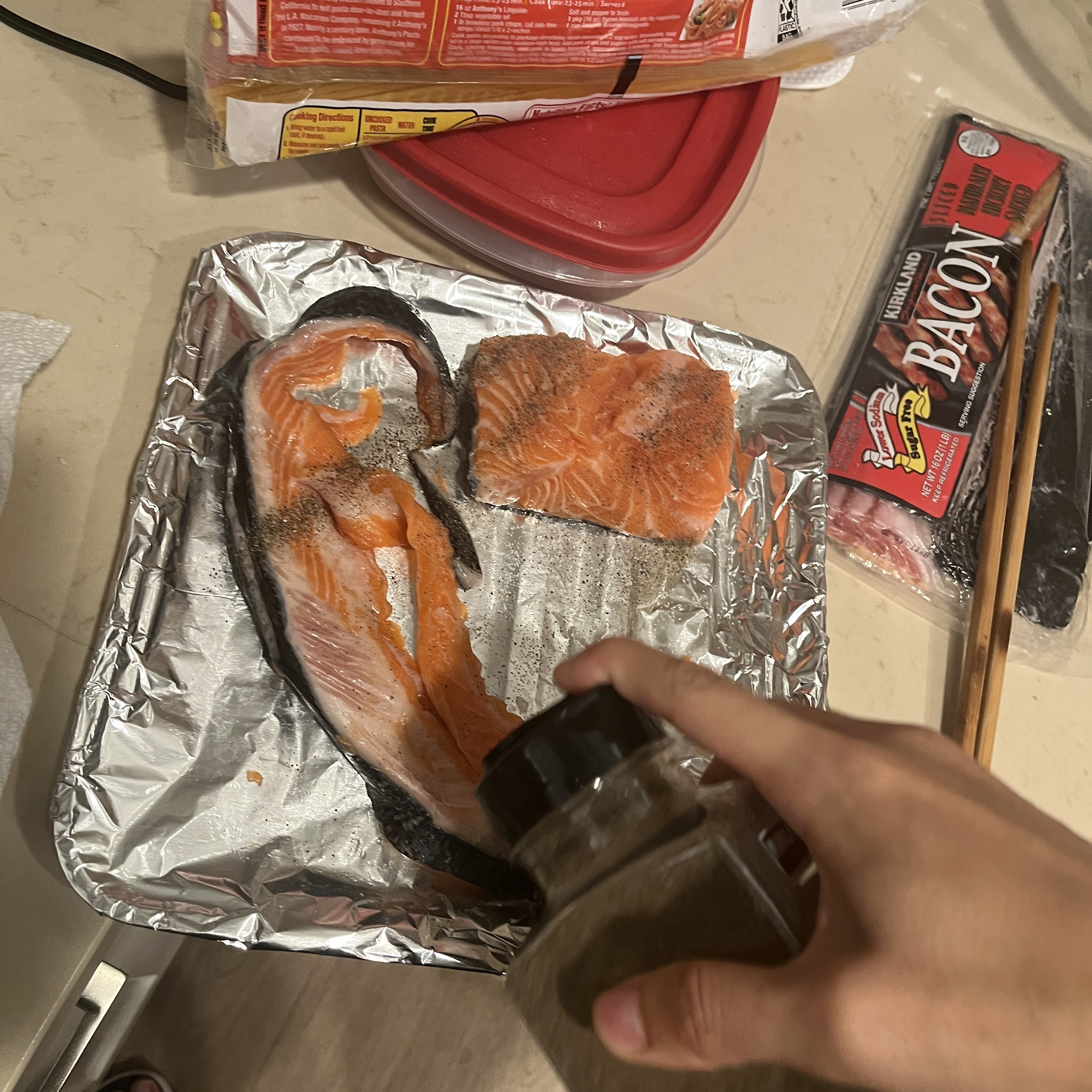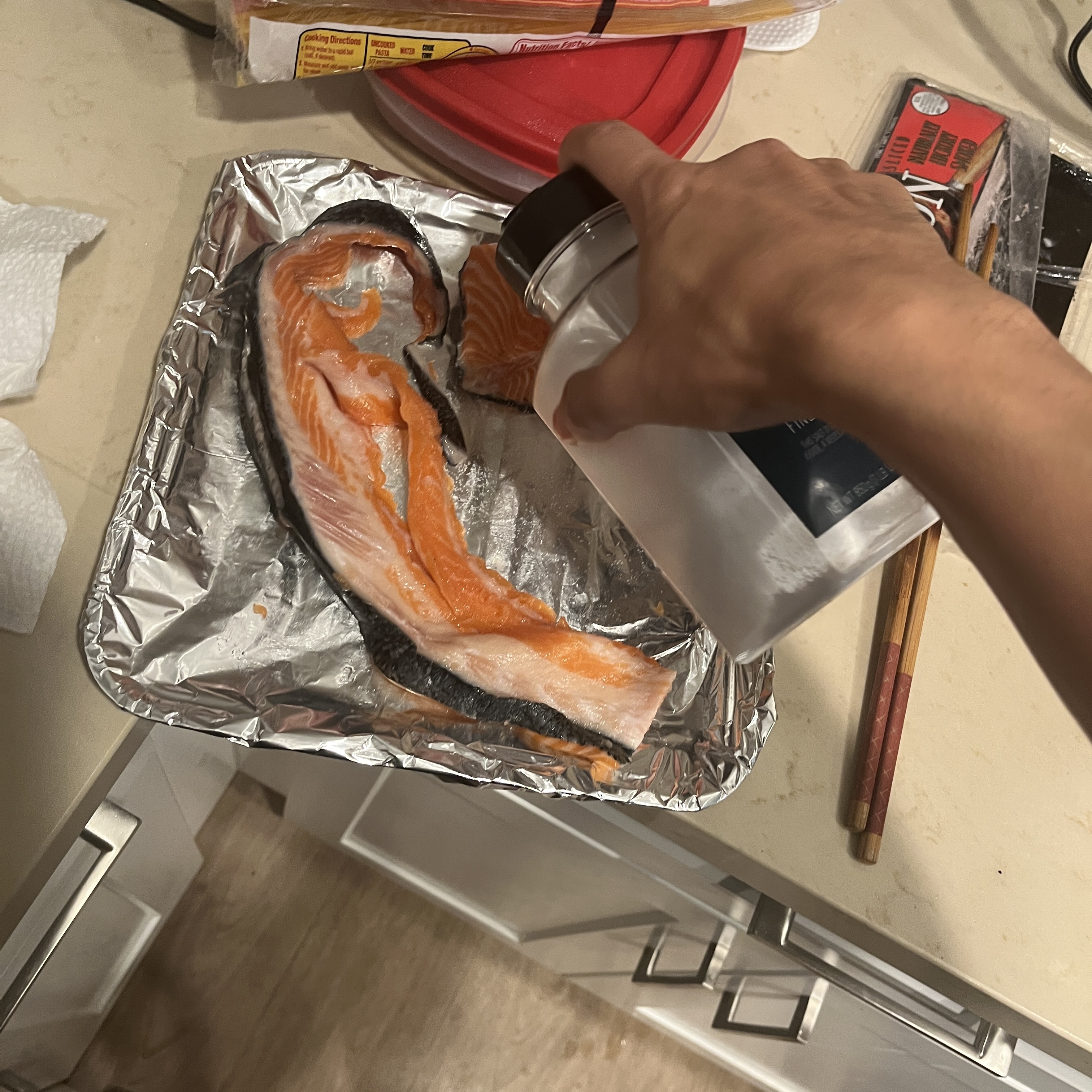 ( 생각보다 많이 뿌려줘도 될듯 해요, 다음에는 생선에 고루 퍼지게끔 해볼 예정 )