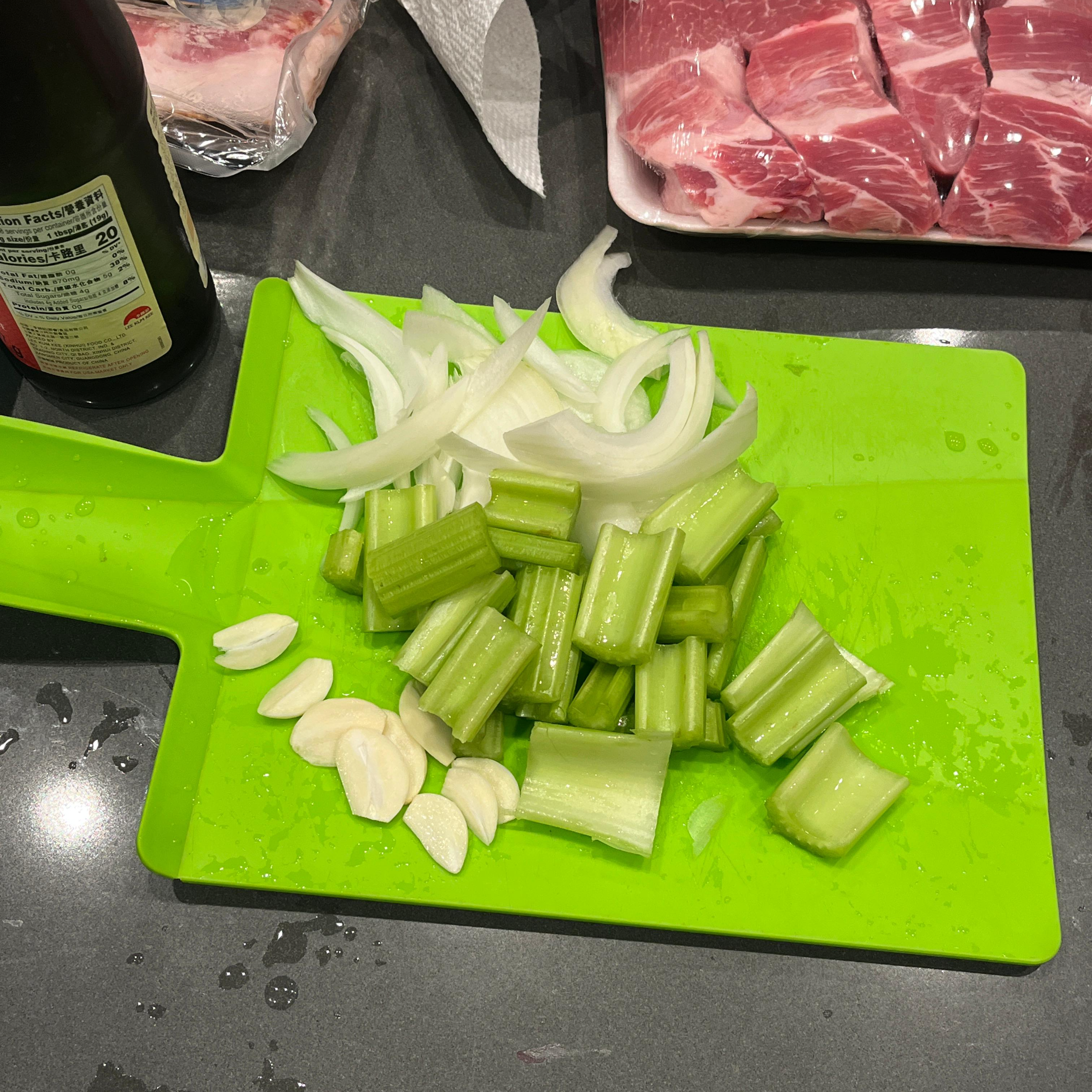 오늘의 메인 재료, 샐러리, 양파, 목살입니다.