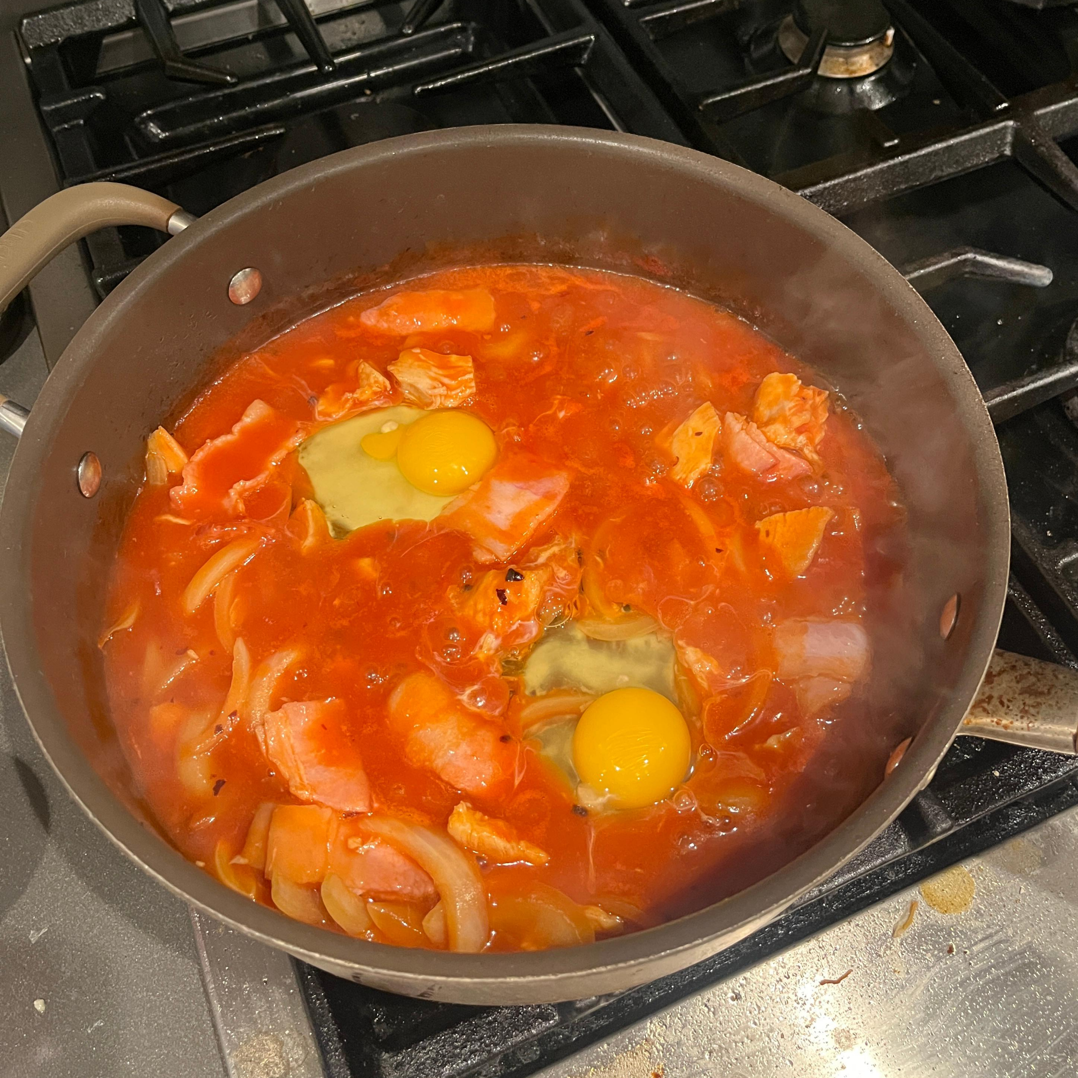 이 요리의 또 다른 핵심인 계란을 두 개 까서 넣어줍니다.