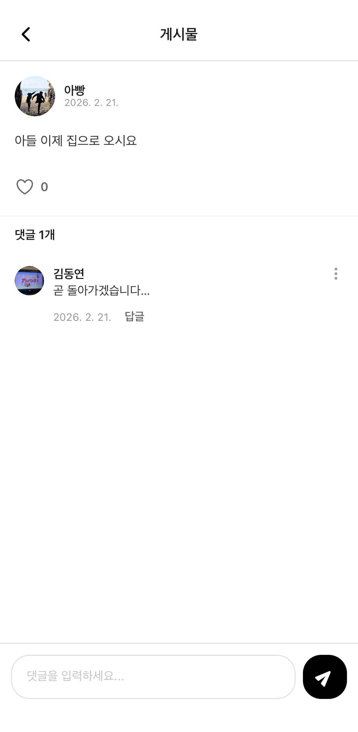 게시글 상세보기 / 댓글은 완전 Threads처럼 개발을 진행할까 했는데 저희 가족 특성상 딱히 쓰레드를 파고 들어가는 댓글이 많이 없을 것이라 예상되어 익숙한 댓글 / 답글 형식으로 만들었습니다.